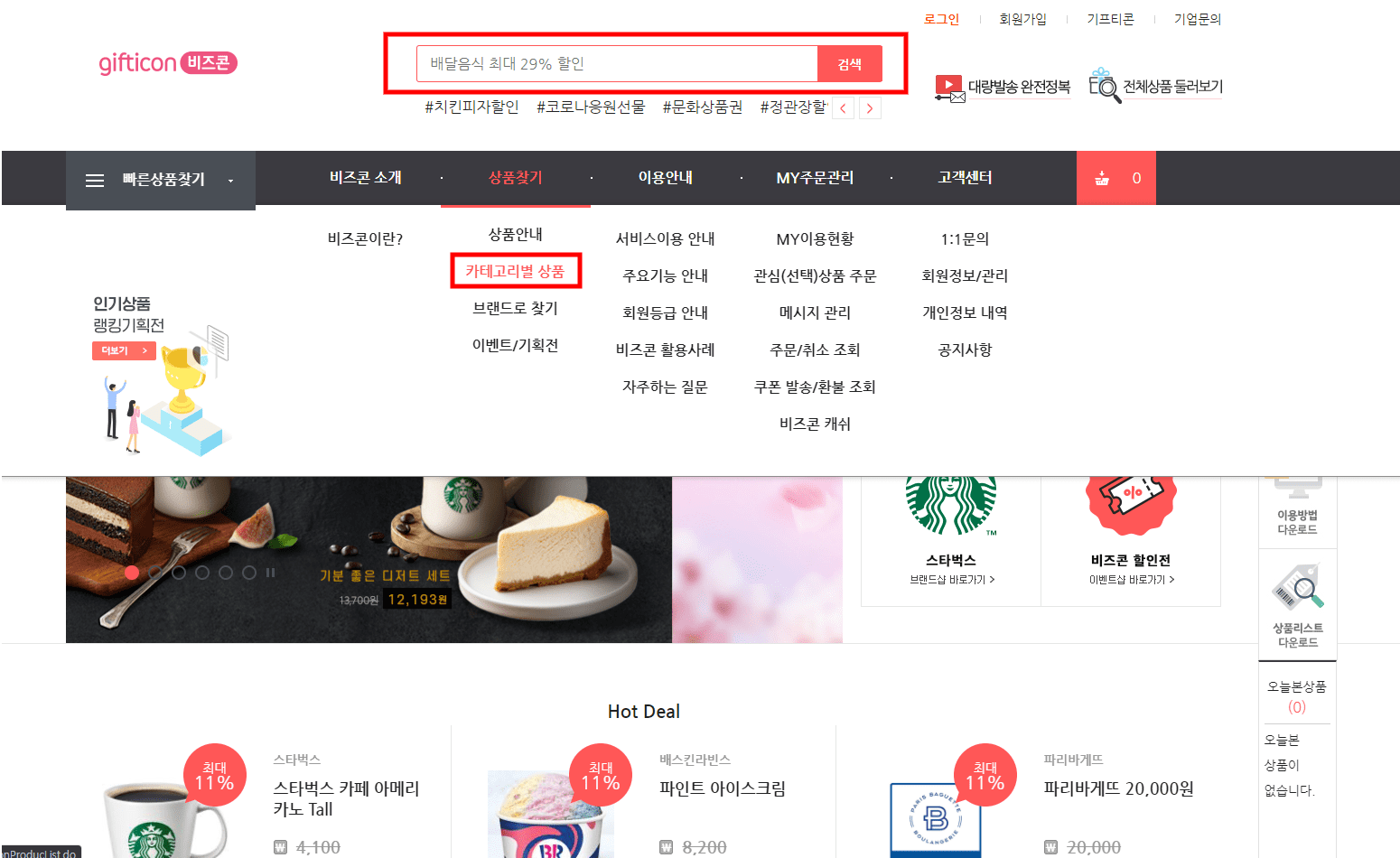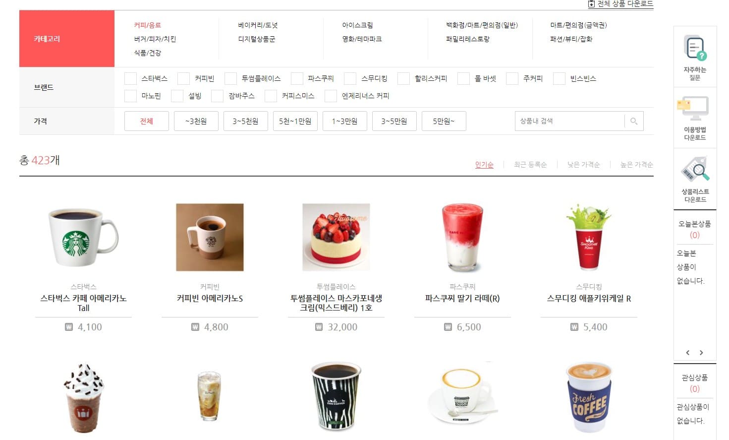 비즈콘에서 카테고리별 상품에 들어가게 되면 선물하기 적합한 상품 목록이 뜨게 됩니다. 카카오톡 선물하기에 있을 법한 상품들은 비즈콘에도 웬만하면 다 있기 때문에 카카오톡 PC 버전으로 선물할 때 유용합니다.