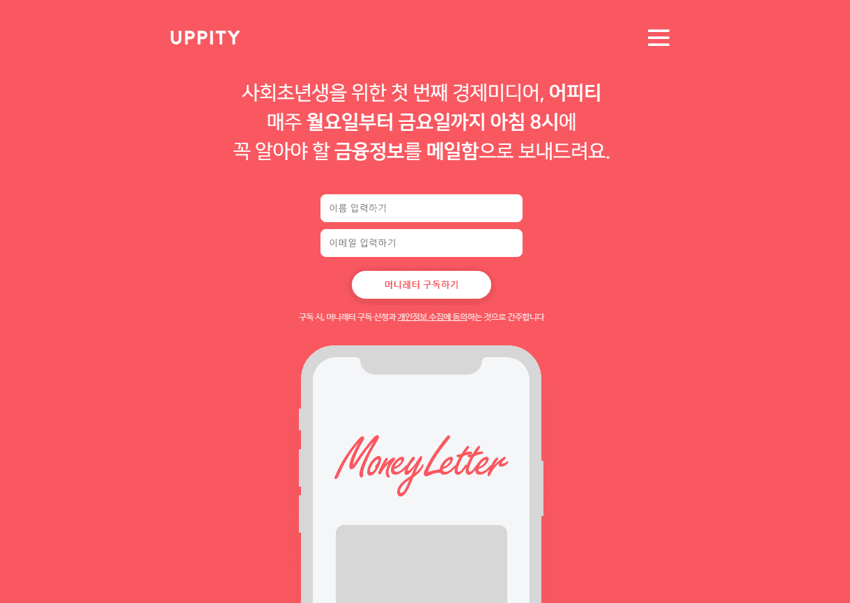 그럼 어피티 이메일 뉴스레터 구독은 어떻게 할까요? 방법은 간단합니다. 아래 링크를 통해 어피티 머니레터 홈페이지에 접속한 뒤 자신의 이름과 이메일을 입력하고 구독하기를 누르면 됩니다.