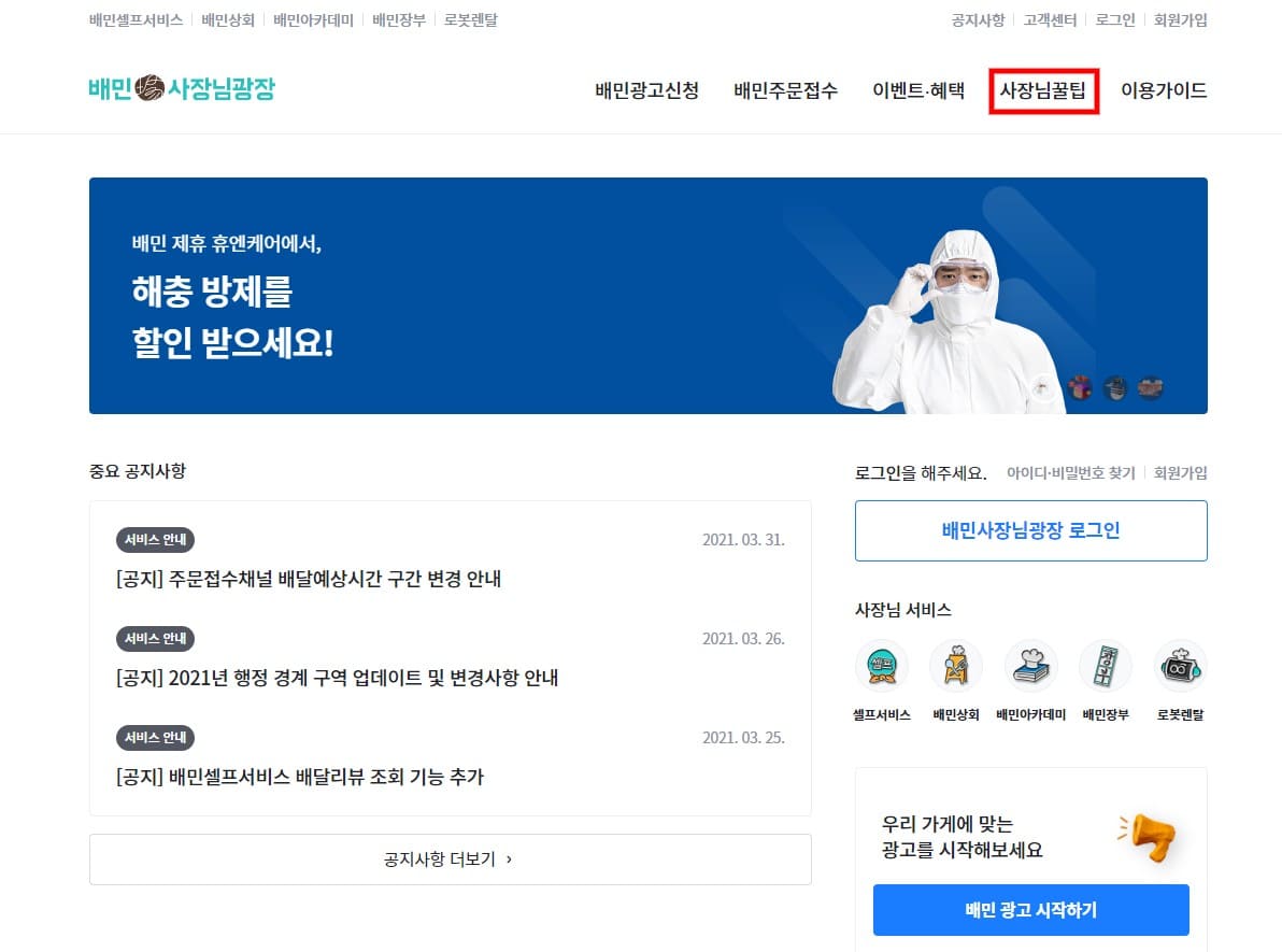 배민 사장님 사이트에 들어가게 되면 위와 같은 화면이 나오게 됩니다. 저희는 여기서 배민 사장님 광장에서 얻을 수 있는 꿀팁을 살펴봐야겠죠. 상단 카테고리에서 '사장님 꿀팁'을 클릭합시다.