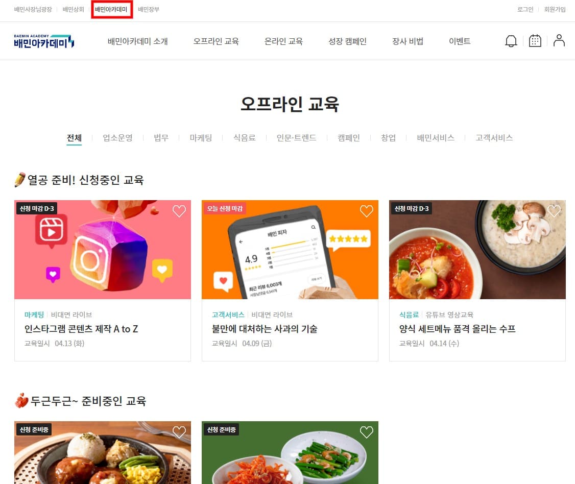 이외에도 배민 사장님 광장에서는 '배민아카데미'를 통해 사장님들께 도움이 되는 교육을 제공하고 있습니다. 배민아카데미 교육은 신청자 중에 선정된 분들만 들을 수 있지만 전부 무료입니다.