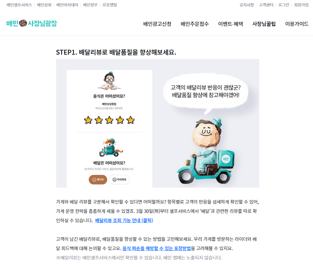 배달의 민족에서 많은 고객들을 끌어들이는 방법 중 하나는 좋은 리뷰를 많이 쌓는 것이죠. 리뷰를 잘 관리하는 방법에 대해서도 배민 사장님 광장 '사장님 꿀팁'에 나와있으니 참고하시면 좋을 듯합니다.